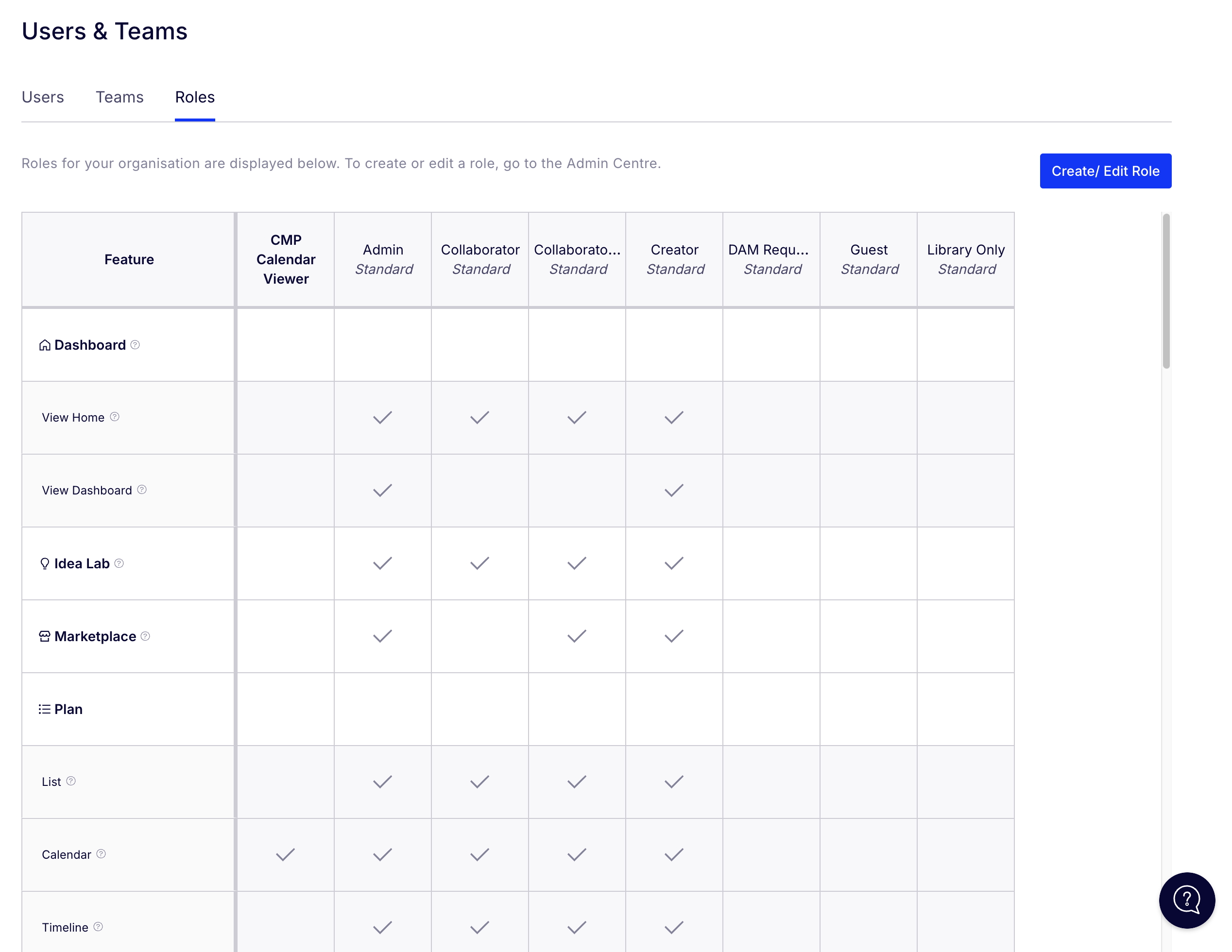 Optimizely CMP comes with a set of standard roles designed to cover common user responsibilities. These include roles such as Administrator, Creator, Collaborator, Collaborator+, and Guest among others. The Administrator role has full access to all features and settings within the platform, including user management, configuration, and reporting. Creators have access to all platform areas, and they are able to create new campaigns, tasks, and events. Collaborators have stricter access, and they can only view and collaborate on campaigns and tasks shared or assigned to them. Collaborators+ have additional access than standard Collaborators, including access to areas such as Idea Lab, Calendar, and Library, and they have the ability to upload directly to the Library. Guests have restricted access and can only access requests from the navigational panel.