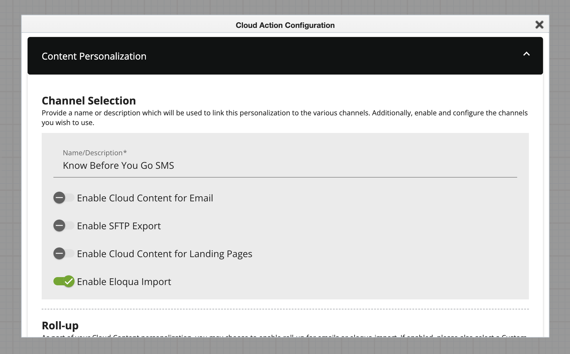 Configuring the new “Eloqua Import” channel option may seem counterintuitive at first. Importing data into a new Eloqua Custom Object when the source is also an Eloqua Custom Object may not make sense, but it is a required step. The new, temporary CDO acts as a temporary holding space, a staging area that allows the Personalization Manager process to restructure data and enable further campaign orchestration, especially for leveraging Eloqua SMS or other SMS providers, such as Twilio, to send personalized text messages similar to Cloud Content for Email.